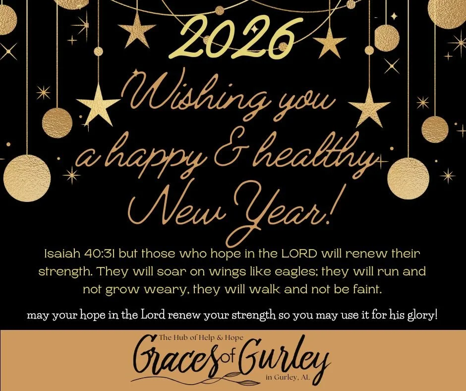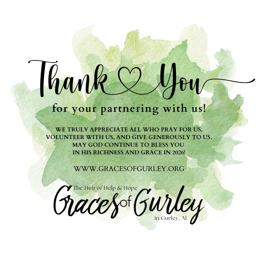 Graces of Gurley has served the Gurley community for 15 years and with the status of a 501(c)(3) for more than 10 years. As we’ve grown, we reflect on the WHY, which boils down to Love God, Love Others. Matthew 22:37-39: "Love the Lord your God with all your heart and with all your soul and with all your mind. This is the first and greatest commandment. And the second is like it: 'Love your neighbor as yourself'".